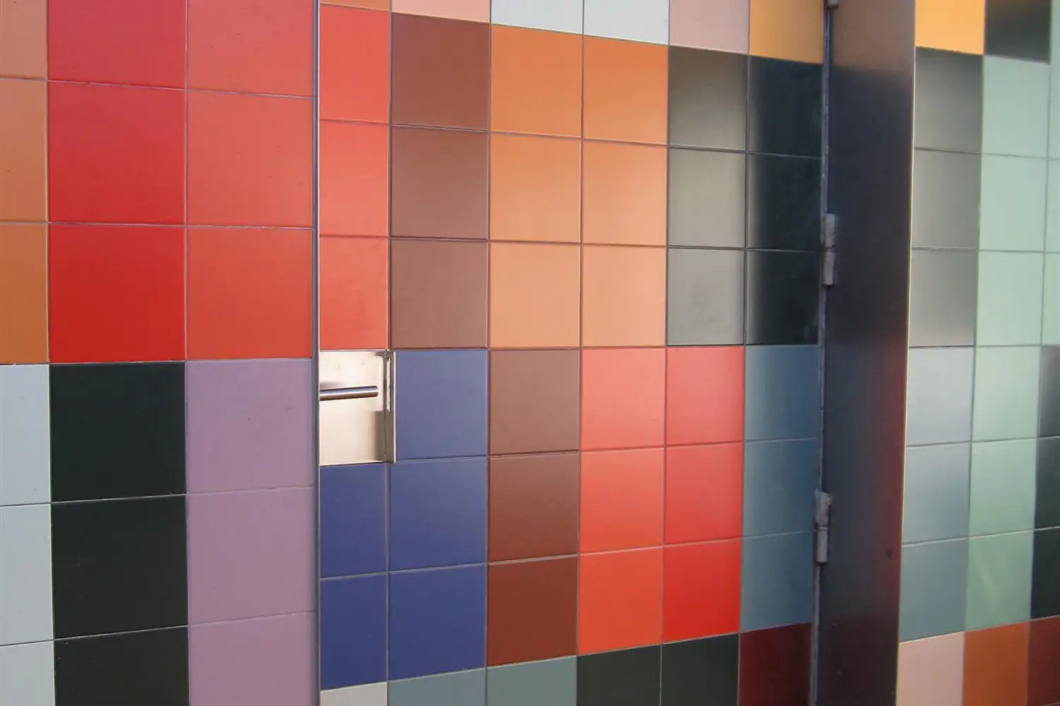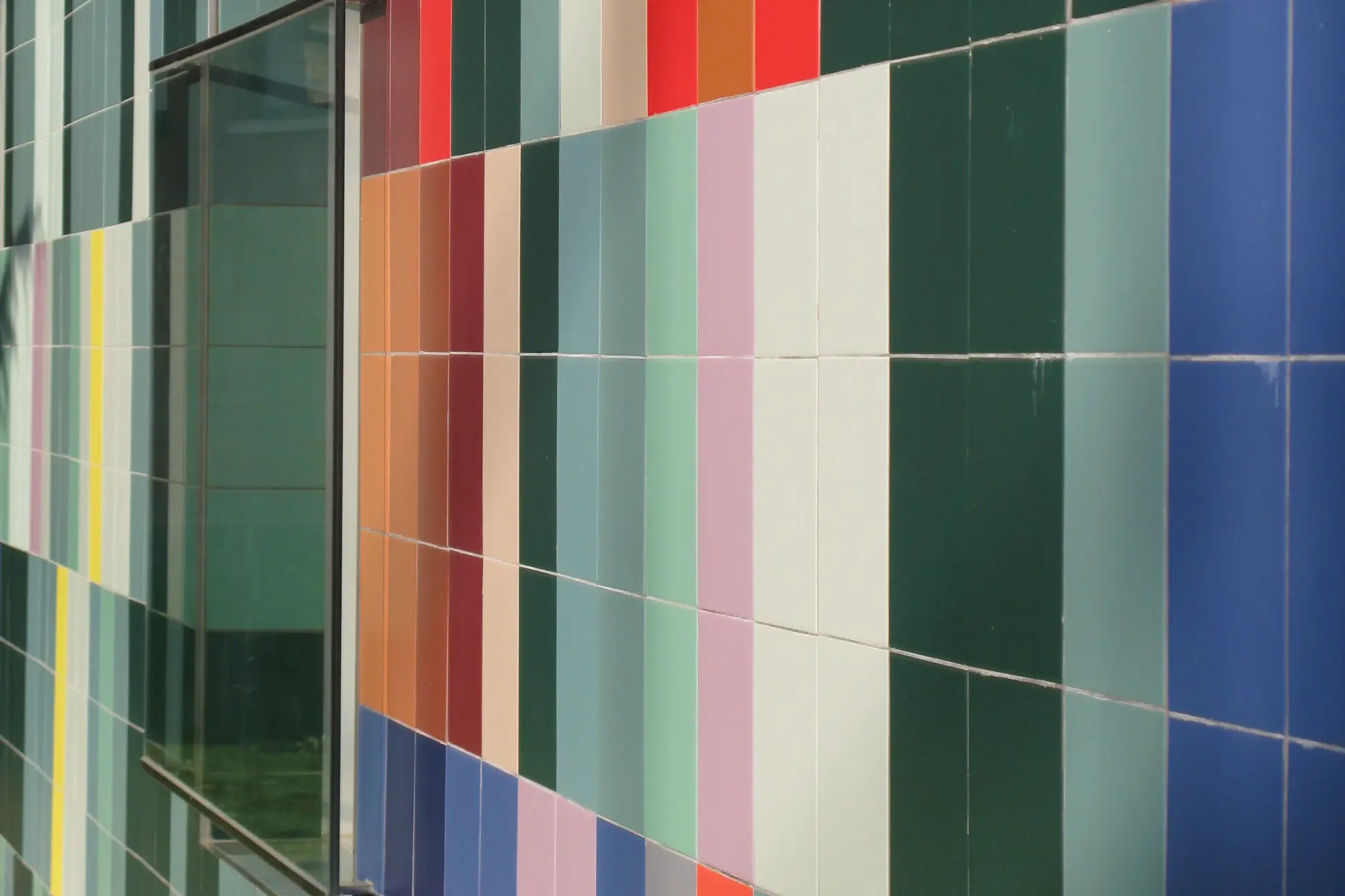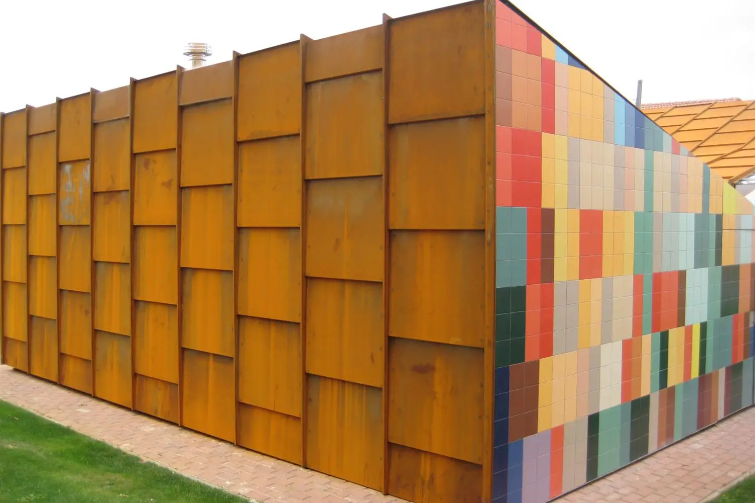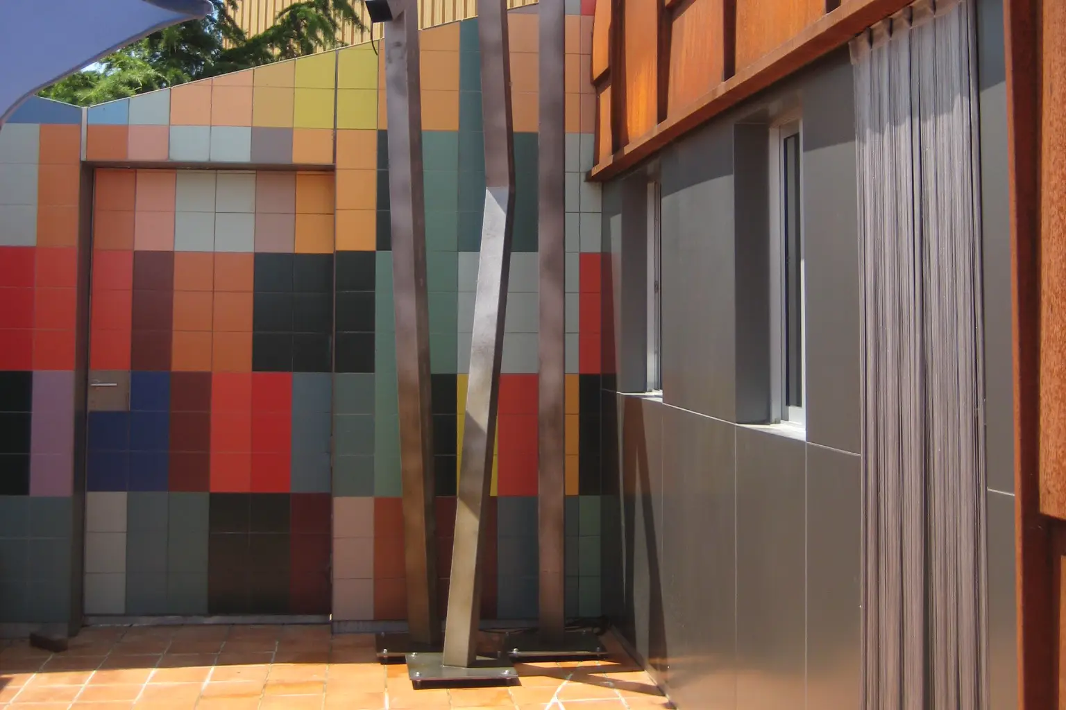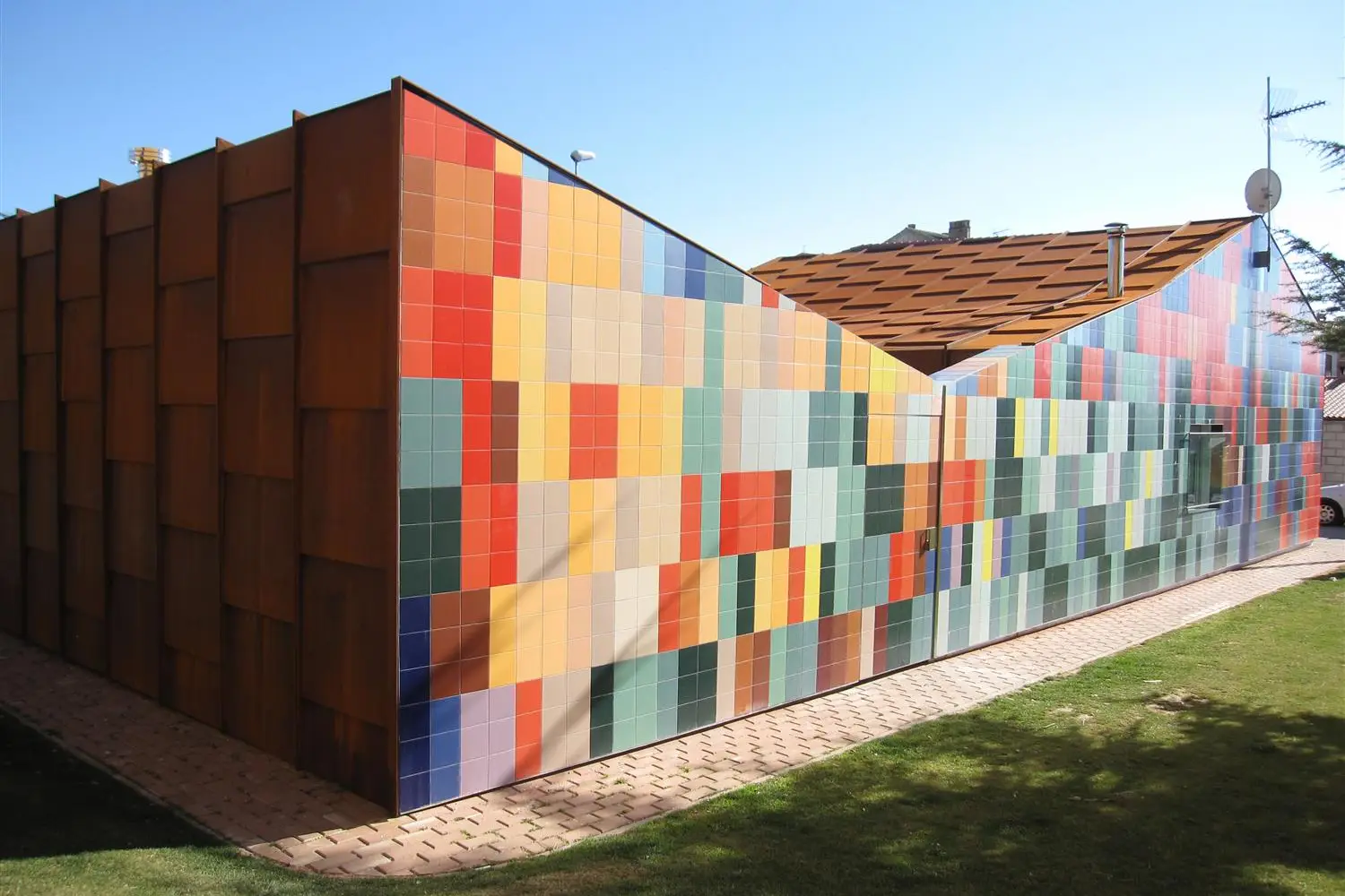 Estos muros se salpican con píxeles de colores, de modo que, en el entorno naturalizado del edificio, el volumen se percibe de manera difusa y las fachadas parecen desvanecerse en el paisaje. Las superficies exteriores se cierran mediante paneles de chapa perforada, mientras que la cubierta a dos aguas mantiene un diálogo sutil con las casas vecinas. Su pendiente recuerda el flujo del agua de lluvia en verano y la acumulación de nieve en invierno, integrando el edificio en su contexto climático y visual.