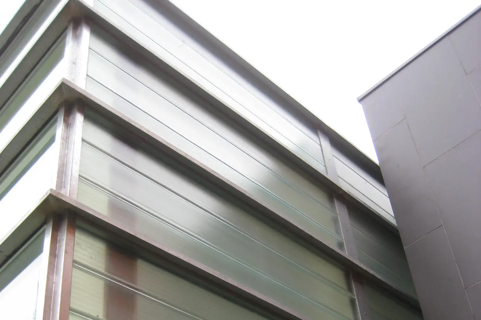 La nueva cubierta exterior actúa como elemento protector y unificador de las actuaciones previas. Dos grandes planos plegados, que se superponen al edificio, parecen flotar de manera independiente sobre el conjunto, aportando ligereza y continuidad al tanatorio.