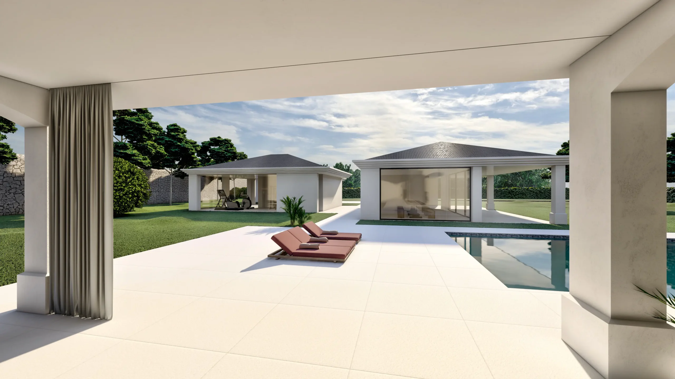 El diseño arquitectónico responde a una geometría clara y ortogonal, formada por volúmenes exentos que se articulan con sencillez y coherencia funcional. El acceso se produce por la fachada norte, mientras que las estancias principales se orientan hacia el sur, donde un porche y una terraza prolongan el interior hacia el jardín y la piscina semienterrada, reforzando la relación entre vivienda y paisaje.